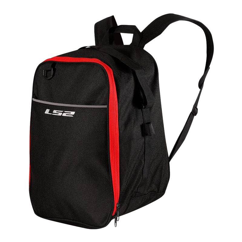 LS2 ryggsäck i svart och rött, designad för att transportera motorcykeltillbehör och personlig utrustning.