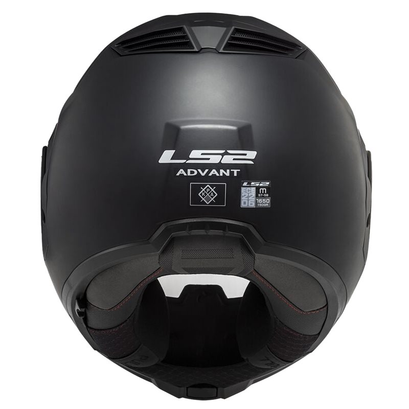 Baksidan av LS2 Öppningsbar Mc-Hjälm Advant Matt Svart, med logotyp och certifieringsmärkningar för säkerhet.