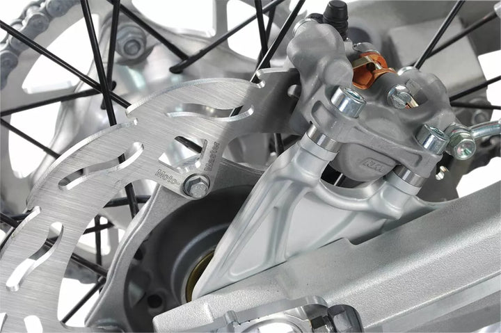 MX/Offroad Adapter Bracket is Need to Mount Oversize Front Flame Disc, Brackets are fully CNC-Machined 6082 Billet aluminum and are used to relocate the stock brake caliper to the correct position in order to accommodate the oversize disc