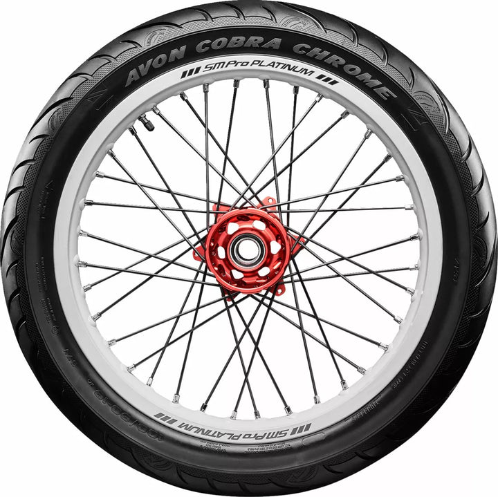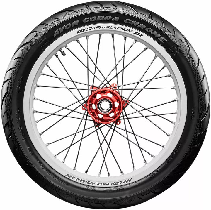 Avon's Latest Tech Pattern and Advanced Construction Produces Over A 5% Larger Footprint Compared To Avon Cobra, High Stability In All Conditions Deliveness Precise Feel and Tire Feedback, Better Traction and Shorter Stopping Distances, Even in the Wet, Incorporates Sports Tirive Longevity ヨ Perfect for Touring, Unique Tire Design with Detaileled Aesthetic Features, Improved Tire Life Over ITS Precessor, Snakeskin-Effect Treat, Reinforced, Aimed at the Power Cruiser/Touring/Custom Market.