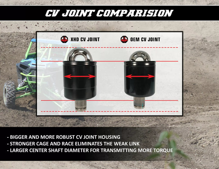 High Quality Lithium Based Grease Containing Molybdenum With High Drop Point, Unique Boot Designing On Riding Terrain for Heat Reduction, Dual Heat Treated Axle Components for Added Strength, 20-30% Larger Componed, CNC Components, Re-Engineered Cage Design to Enhance Durability, Entire Axle Made Up of 4340 Chromoly Steel, Swing Angle Up To 47 ᄚ, Two Year Limited Warranty