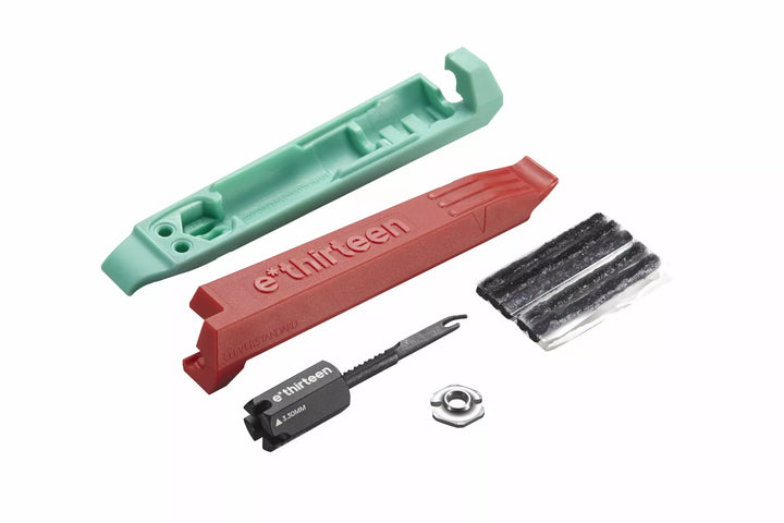 Take the frustration out of flat tires with e*thirteen's tire liver and plug repair kit., This handy and compact tool is a combination of 2 sturdy composite tire livers which encase a tire plug needle and 5x3.5mm self-adhesive. Theyre some of the toughest livers on the market, designed for dh casing tire use, act as a Comfortable handle for the tire plug needle, making insertion into the heaviest Case Tires a Breeze, and Include 4 sizes of spoke wrenches, for spokes Includes: 2 Composite Tire Liver's Designed for DH Case Tire Toughness + Puncture Plug Needle and 5 Extra Thick 3.5mm Self-Adhesive plugs +3.23, 3.30, 3.45, 3.96mm Spoke Wrenches