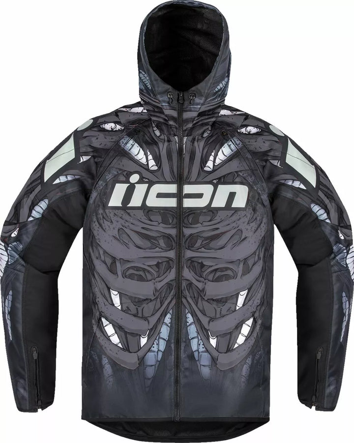 AirForm Manik'r ™ Graphic on Front and Back of Jacket, 420D Polyester Chassis With 300D Polyester Internal Reinforcing, PU-Coated Shell Material with DWR Finish, D30® Removable Viper Back Protector; Elbow and shoulder Impact Protectors, Bungee Cord Style Drawstring Hood, AirFly ™ Center Front Mesh Panel with Chest and Back Zippered Vents, Vented Cuff Zippers, Back Protector en 1621-2 Level 1