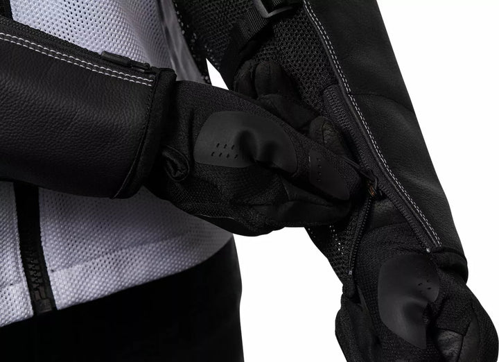 Durable 300D Polyester and Iron Weave ™ Mesh Chassis, 1.2 mm-1.4 mm Tracspec ™ Leather in Primary Crash Zone, Adjustable Waist and Arm Strap, ICon® Sport Fit, YKK® Zippers, Back Protector EN 1621-2 Level 1, EN170-70-2