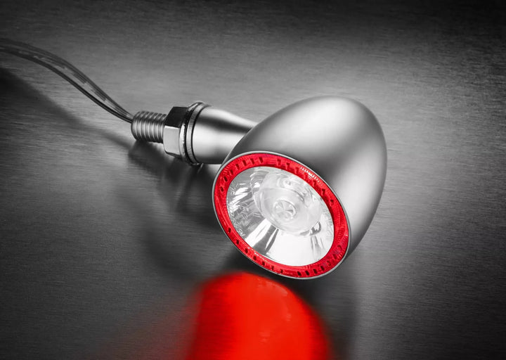 Bullet 1000® DF LED Indicator 3 in 1, Black, Rear, Indicator and Brake Lights on Both Sides., Classic Meets Hightech: The Bullet 1000® RB Combines and Replaces The Original Rear and Brake Lights at the Tail of the Motorcycle. The High Quality Metal Housing Fits Any Demanding Bike Style Like A Jewel. The Homogenous Circular Red Rear Light Ring Adds a Spectacular Appearance. , The Radiant Brake Light Keeps The Following Traffic at Distance, Thus Ensuring More Safety On The Road. In addition to the tests Kellermann Highpower Led Technology The Special for This Series Developed Kellermann HPT® Light Technology Ensures A Homogeneous Circular Beam, Bringing the Overall Impression of the Product to Perfection. Available in Chrome or Black the Bullet 1000® RB Can Be Combined With Other Indicator Series E.G. Bullet 1000® or the Miniature Atto® Series., SUITABLE FOR 12 VOLT DC Applications., European Design Protection.
