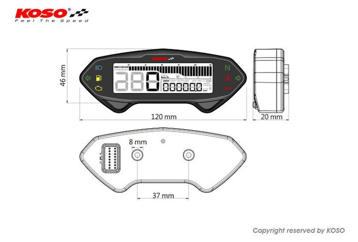 The Koso DB-01RN Offer More Features: Digital Speeseteter with Bar Tachometer, Fuel Level Meter, 2 Trip Meters ... an Allrunder Gauge, in a very tinny size! Digital Multifonctions Speedometerfits On Most Vehiclestelltales: Turn, High Beam, Oil, Neutral, Fuel, EODB, Engine Functions: Speedometer Km/H (OR MPH), Up to 360km/H (or 223MPH) ODEMEMPAGE Circumferencefuel Level: 1 Segment = 20% of Tank CapacitySupply Voltage: 12Ve-Mark Approvalstroke/ Piston Setting: 2t 1 To 4 Pistons4t 1 To 12 Pistons