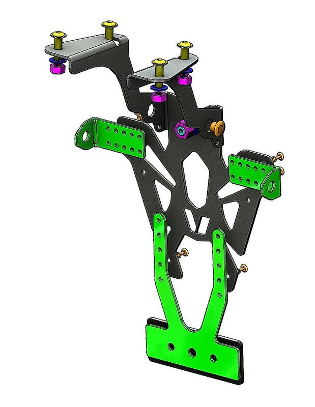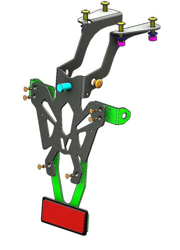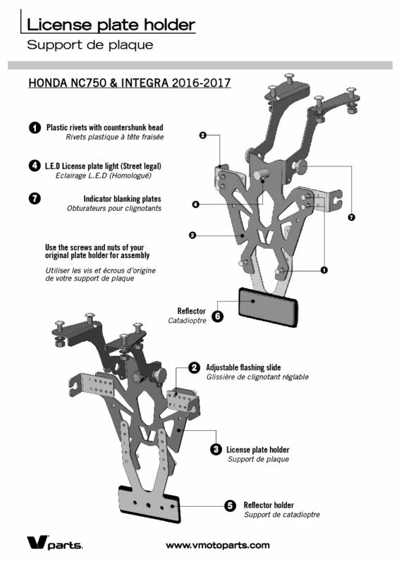 V PARTS license plate holder are manufactured in France. Inconspicuous and perfectly finished, they are specifically developed for the attached bike application list. 2mm thin but sturdy steel license plate holder Black epoxy painting CNC Manufactured – laser cut: precise finish Holes to fix license plate, indicators and license plate lighting Made in France Contents: Street legal license plate lighting, EU certified Adjustable reflector plate Reflector, EU certified More info: Optimized and discreet cable passageway Fast & easy mounting Adjustable indicators brackets Fits EU plates Indicator lights spacing: 170 to 220mm Color: Black Homologation: CE homologated Material: Steel