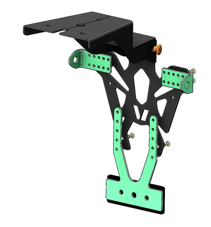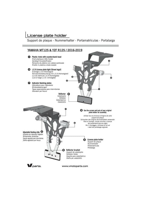 V PARTS license plate holder are manufactured in France. Inconspicuous and perfectly finished, they are specifically developed for the attached bike application list. 2mm thin but sturdy steel license plate holder Black epoxy painting CNC Manufactured – laser cut: precise finish Holes to fix license plate, indicators and license plate lighting Made in France Contents: Street legal license plate lighting, EU certified Adjustable reflector plate Reflector, EU certified More info: Optimized and discreet cable passageway Fast & easy mounting Adjustable indicators brackets Fits EU plates Indicator lights spacing: 170 to 220mm Color: Black