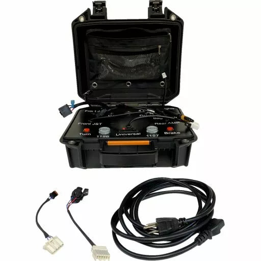 Custom Dynamics® Product Test Case is a Necessity in any dealership or motorcycle shop; Eliminate The Guess Work in Customer Warranty Claims and Product Troubleshooting with this Complete Test Kit, Pre-Wired and equipped with plugs for connecting custom Dynamics® Most Popular Led Lighting Products; It Also has easy to use terminal connectors for universal wiring products, this compact case plugs into an electrical reciple for power and has Built-in Brake and turn signal momentary switches for testing all Applicable product functions Connectors, Running Power Switch, Brake & Turn Signal Momentary Switch, Includes 2 Wire Adapters for Expanded Fitments, Power Adapter Included