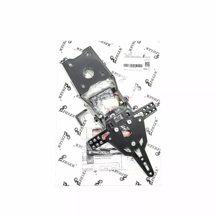 The License Plate Holder is Extremely Durable and Weather Proof., Black Powder Coated. , The License Plate Holder Can Be Used For Any Kind of License Plate (175mm Width)., No Modification of Fairing Required., Stepless Adjustment of Rake Angle., Indicator Support Adjustable in 3 Positions. Plate., Special Indicator Light Mounts (Sold Separately) Required for Stock Indicator Lights., Kit Includes: 1 License Plate Holder Incl. Mounting Kit., LED License Plate Light "E Approsved" Incl. Support., Back Light With Support. Of: Germany, Slovenia, Croatia & UK.