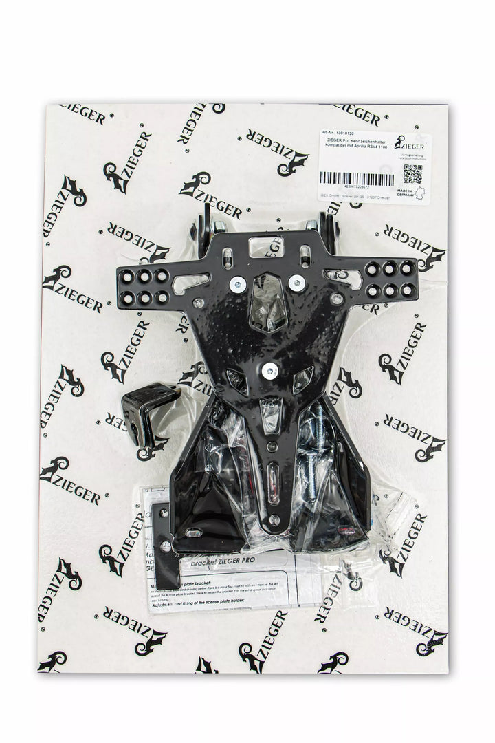 The License Plate Holder is Extremely Durable and Weather Proof., Black Powder Coated. , The License Plate Holder Can Be Used For Any Kind of License Plate (175mm Width)., No Modification of Fairing Required., Stepless Adjustment of Rake Angle., Indicator Support Adjustable in 3 Positions. Plate., Special Indicator Light Mounts (Sold Separately) Required for Stock Indicator Lights., Kit Includes: 1 License Plate Holder Incl. Mounting Kit., LED License Plate Light "E Approsved" Incl. Support., Back Light With Support. Of: Germany, Slovenia, Croatia & UK.