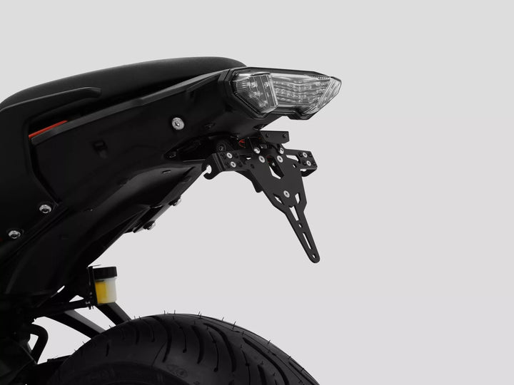 The License Plate Holder is Extremely Durable and Weather Proof., Black Powder Coated. , The License Plate Holder Can Be Used For Any Kind of License Plate (175mm Width)., No Modification of Fairing Required., Stepless Adjustment of Rake Angle., Indicator Support Adjustable in 3 Positions. Plate., Special Indicator Light Mounts (Sold Separately) Required for Stock Indicator Lights., Kit Includes: 1 License Plate Holder Incl. Mounting Kit., LED License Plate Light "E Approsved" Incl. Support., Back Light With Support. Of: Germany, Slovenia, Croatia & UK.
