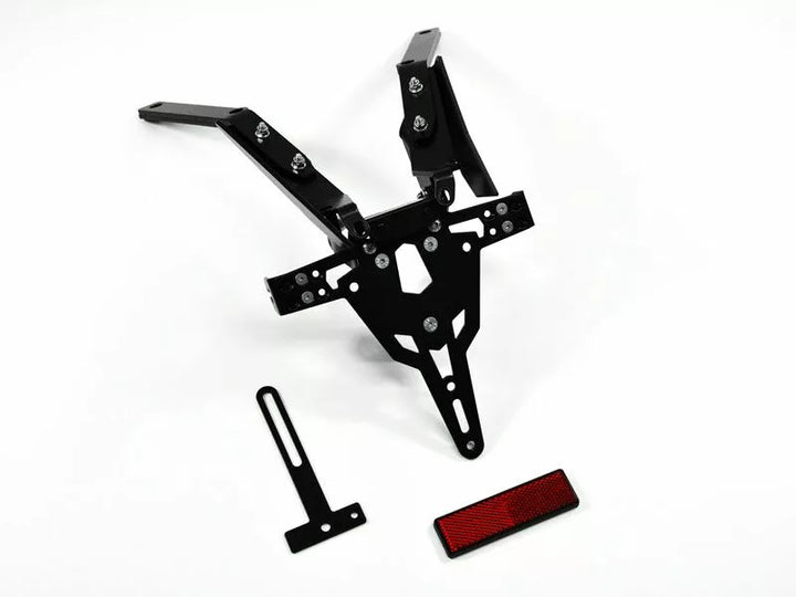 The License Plate Holder is Extremely Durable and Weather Proof., Black Powder Coated. , The License Plate Holder Can Be Used For Any Kind of License Plate (175mm Width)., No Modification of Fairing Required., Stepless Adjustment of Rake Angle., Indicator Support Adjustable in 3 Positions. Plate., Special Indicator Light Mounts (Sold Separately) Required for Stock Indicator Lights., Kit Includes: 1 License Plate Holder Incl. Mounting Kit., LED License Plate Light "e Approved" Incl. Support., Back Light With Support.