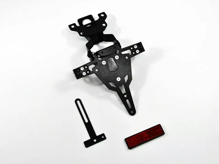 The License Plate Holder is Extremely Durable and Weather Proof., Black Powder Coated. , The License Plate Holder Can Be Used For Any Kind of License Plate (175mm Width)., No Modification of Fairing Required., Stepless Adjustment of Rake Angle., Indicator Support Adjustable in 3 Positions. Plate., Special Indicator Light Mounts (Sold Separately) Required for Stock Indicator Lights., Kit Includes: 1 License Plate Holder Incl. Mounting Kit., LED License Plate Light "e Approved" Incl. Support., Back Light With Support.