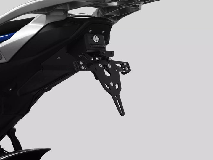 The License Plate Holder is Extremely Durable and Weather Proof., Black Powder Coated. , The License Plate Holder Can Be Used For Any Kind of License Plate (175mm Width)., No Modification of Fairing Required., Stepless Adjustment of Rake Angle., Indicator Support Adjustable in 3 Positions. Plate., Special Indicator Light Mounts (Sold Separately) Required for Stock Indicator Lights., Kit Includes: 1 License Plate Holder Incl. Mounting Kit., LED License Plate Light "e Approved" Incl. Support., Back Light With Support.