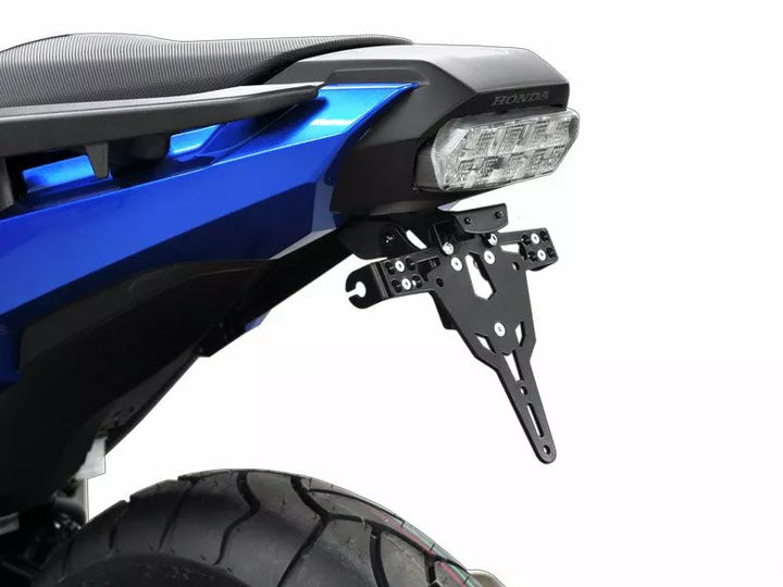 The License Plate Holder is Extremely Durable and Weather Proof., Black Powder Coated. , The License Plate Holder Can Be Used For Any Kind of License Plate (175mm Width)., No Modification of Fairing Required., Stepless Adjustment of Rake Angle., Indicator Support Adjustable in 3 Positions. Plate., Special Indicator Light Mounts (Sold Separately) Required for Stock Indicator Lights., Kit Includes: 1 License Plate Holder Incl. Mounting Kit., LED License Plate Light "e Approved" Incl. Support. Of: Switzerland, Poland and Ireland.