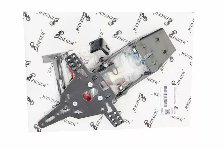 The License Plate Holder is Extremely Durable and Weather Proof., Black Powder Coated. , The License Plate Holder Can Be Used For Any Kind of License Plate (175mm Width)., No Modification of Fairing Required., Stepless Adjustment of Rake Angle., Indicator Support Adjustable in 3 Positions. Plate., Special Indicator Light Mounts (Sold Separately) Required for Stock Indicator Lights., Kit Includes: 1 License Plate Holder Incl. Mounting Kit., LED License Plate Light "E Approsved" Incl. Support., Back Light With Support. Of: Germany, Slovenia, Croatia & UK.