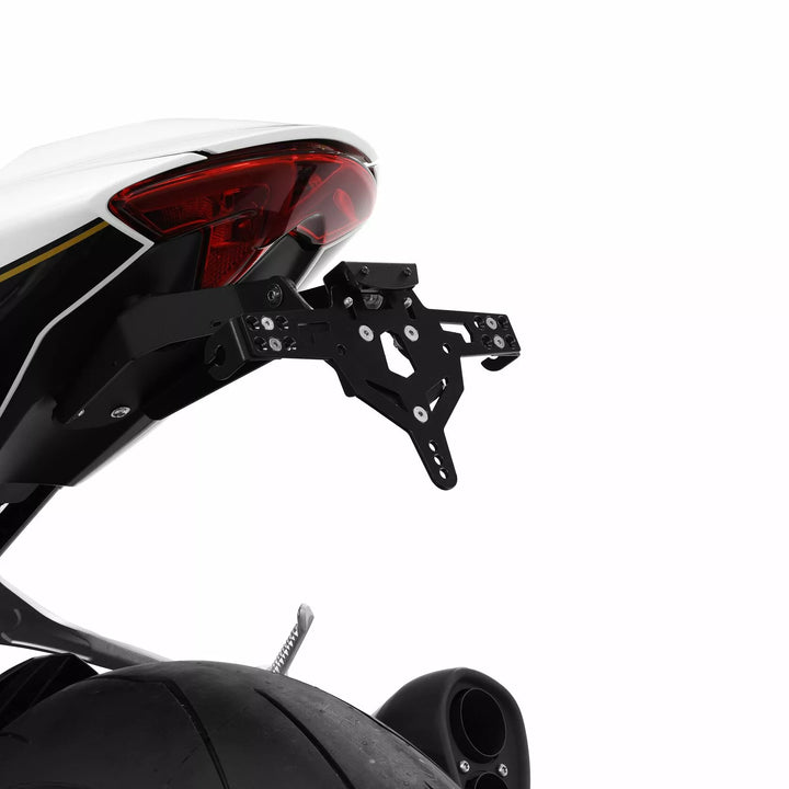 The License Plate Holder is Extremely Durable and Weather Proof., Black Powder Coated. , The License Plate Holder Can Be Used For Any Kind of License Plate (175mm Width)., No Modification of Fairing Required., Stepless Adjustment of Rake Angle., Indicator Support Adjustable in 3 Positions. Plate., Special Indicator Light Mounts (Sold Separately) Required for Stock Indicator Lights., Kit Includes: 1 License Plate Holder Incl. Mounting Kit., LED License Plate Light "e Approved" Incl. Support., Back Light With Support.