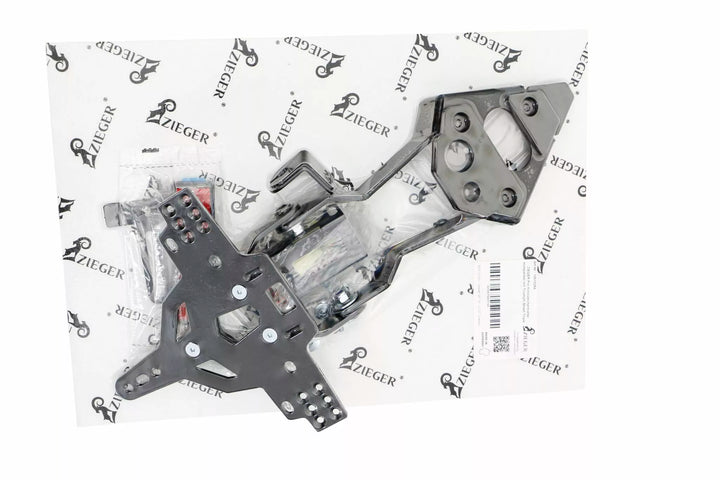The License Plate Holder is Extremely Durable and Weather Proof., Black Powder Coated. , The License Plate Holder Can Be Used For Any Kind of License Plate (175mm Width)., No Modification of Fairing Required., Stepless Adjustment of Rake Angle., Indicator Support Adjustable in 3 Positions. Plate., Special Indicator Light Mounts (Sold Separately) Required for Stock Indicator Lights., Kit Includes: 1 License Plate Holder Incl. Mounting Kit., LED License Plate Light "e Approved" Incl. Support. Of: Switzerland, Poland and Ireland.