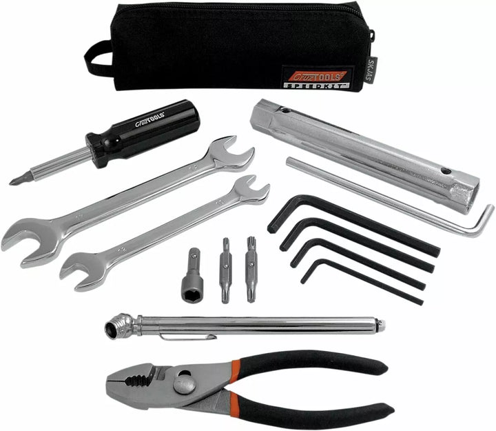 Ultra-Compact Tool Kit Packed With Functionality for Metric Motorcycles, UTV, ATV, Snowmobiles, Snow Bikes, and Personal Watercraft, Dimensions Are Approximately 7 "X 2" X 2 ", Kit Includes, 10x12 mm Open End Wrench, 14x17 mm combo Spark plug wrench with liver, mini 5-in-1 screwdriver with torx t20, 25, 27, 30 bits, hex keys: 3, 4, 5, 6 mm, 10-50 pne pneumatik, 5,5 "kleště-job-job, těžký zip-up pouzdro, život