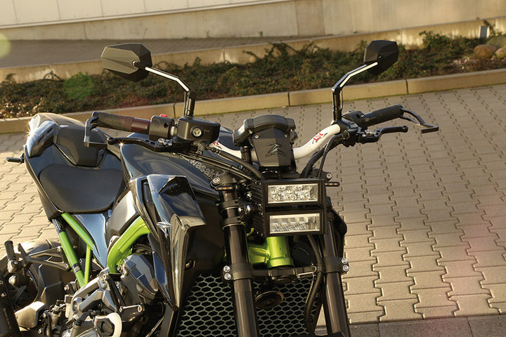 Tato sada LED světlometů připojená k držáku vlny Highsider se skládá z vysokého světlometu s vysokým paprskem a nízkým světlometem s polohovým světlem.