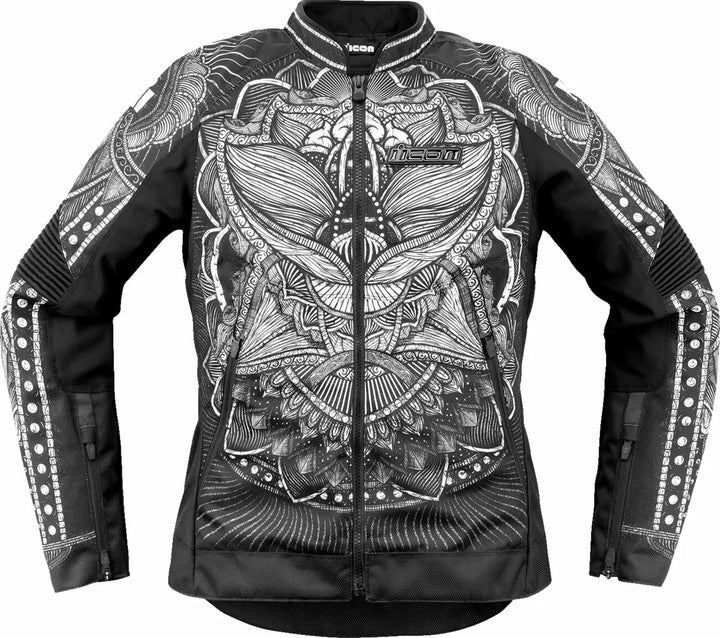 Bunda Women's Overlord3 NOBLE ™ s grafikou ALLORV vytištěné na polyesterovém podvozku 1680D a 300D a interní 300D polyesterové výztuže, ICON® Dámský sport fit s předem zakřivenými zbraněmi a tvarovaným tělem, D30 Pane Mesh Certs, Protector; Ochrany loketního a ramenního dopadu, odnímatelná izolovaná vložka vesty, chránič zadního zadku EN 1621-2 Úroveň 1