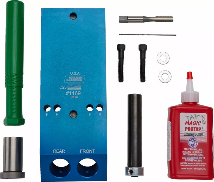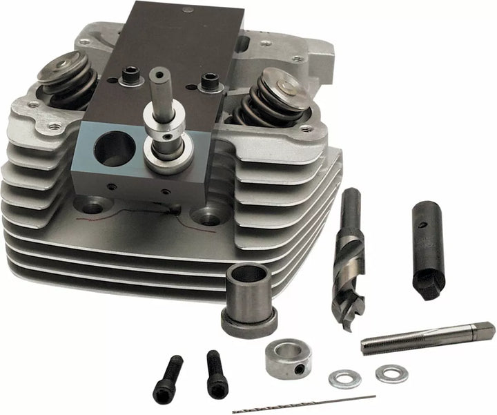 Instalační sada zahrnuje fixte, vrták, kousek na obličeji a nástroj pro klepnutí na nitě, jednoduše vrták, bodový obličej, klepnutím a instalaci kompresního uvolňování, pracuje na přední a zadní hlavě, s nainstalovanými ventily nebo bez nich, pro big-palcové nebo vysoce komprese Twin Cams