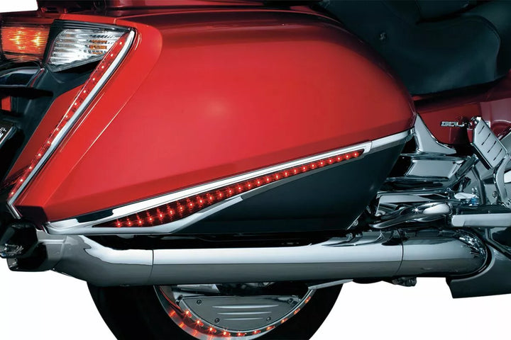 Funkce Super Světlé LED diody fungující jako běžící světla a otočné signály, odpovídají liniím skladeb sedla, přemostěte mezeru mezi texturovanou černou a malovanou karoserií, červené čočky vykládané do brilantního chromu, zadní příslušenství