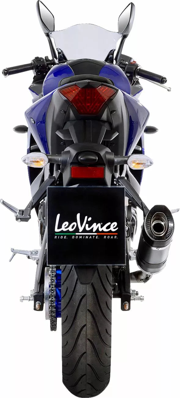 AISI 304 Nerezové pouzdro, koncový čepice „Shark Cut“ s plným uhlíkem, zabalení odolné vůči vysoké teplotě (1 650 ᄚ F), plné upevnění upevňovací popruh, laserové leptané logo Leovince