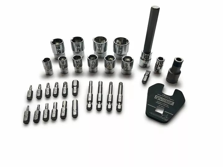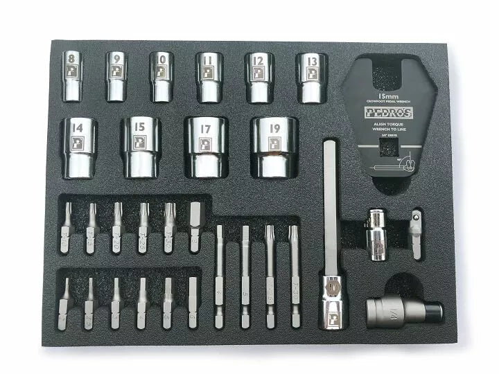 Pedro's Pro Bit Bit and Socket Set je navržena tak, aby pracovala s našimi točivými klíči a bitovými jednotkami a nabízí celou řadu nástrojů pro profesionální mechanik hex, torx, zásuvku a potřebu pedálu. Rozsáhlá sada je perfektním společníkem pro točivé momentové klíče. Crowfoot Pedal Wrench a 3 adaptéry s pohonem v držáku pěny. , Premium S2 Tool Steel Bits, Chrome Vanadium Sockets a Precision Laser Cut Tool Steel Crowfoot zajišťují pevnost a trvalý výkon. Pohon)., Torx T10, T15, T20, T25 a T30 (25 mm), T25 a T30 (50 mm)., Sockets 8,9,11,12,13 mm (1/4 "pohon), 14,15,17,19 mm (3/8" pohon). Adaptéry 1/4 "čtvereční až 1/4" hex, 1/4 "hex na 1/4" čtvereční a 3/8 "čtvereční až 1/4" hex.