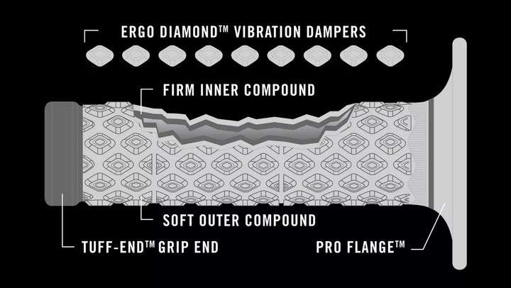 Pro příruba vytvořená pro snížení otěru palce na základě rozsáhlé zpětné vazby jezdce, měkké vnější sloučeniny a pevné vnitřní sloučeniny, vibrační tlumiče Ergo Diamond ™, End Grip ™ Grip End
