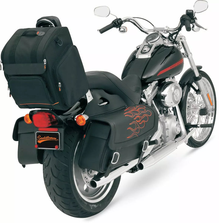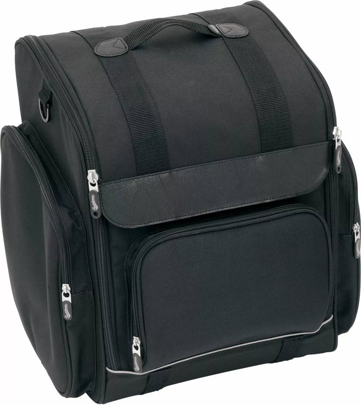Pohodlná velikost, plná funkcí, snadná montáž a neuvěřitelná hodnota, robustní, plně tuhá konstrukce drží tvar sáčku, i když je prázdný, plně nastavitelný montážní systém zahrnuje dvě pasti; Mount onto sissy bar, luggage rack or back seat, zip/hook-and-loop wide top opening with gusseted zip front, top carry handle and backpack/shoulder strap for easy toting off bike, Lockable zipper puls, features three exterior zipper pocket pocket Constructed of UV, Water and Weather resistant 1200-Deniers Saddletuff ™ and Saddlehyde ™ Panels, Dimensions: 16 "W X 17" H X 11.5 "D; měří 1 900 kubických palců, rozměry EU 40,64 cm Šířka x 43,18 cm výška x 23.