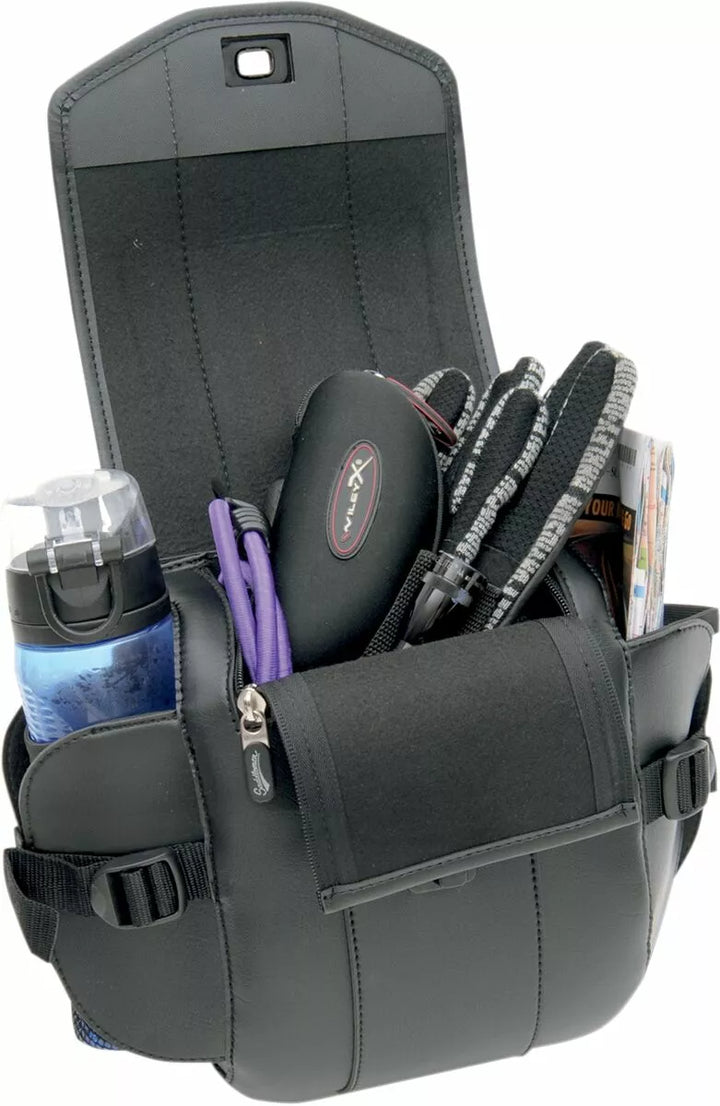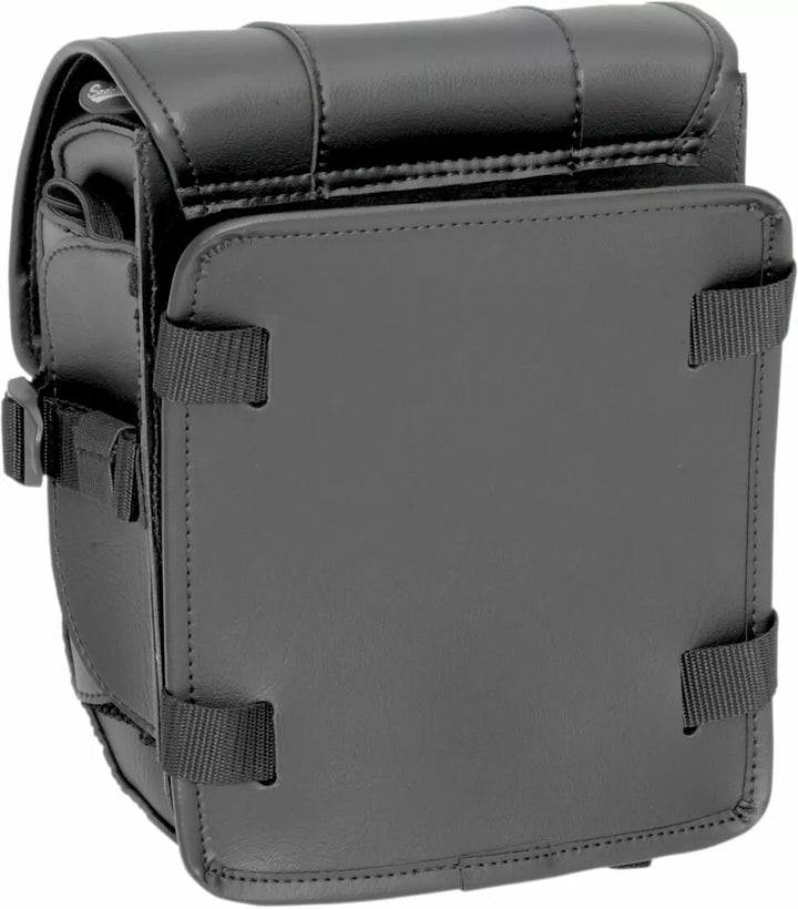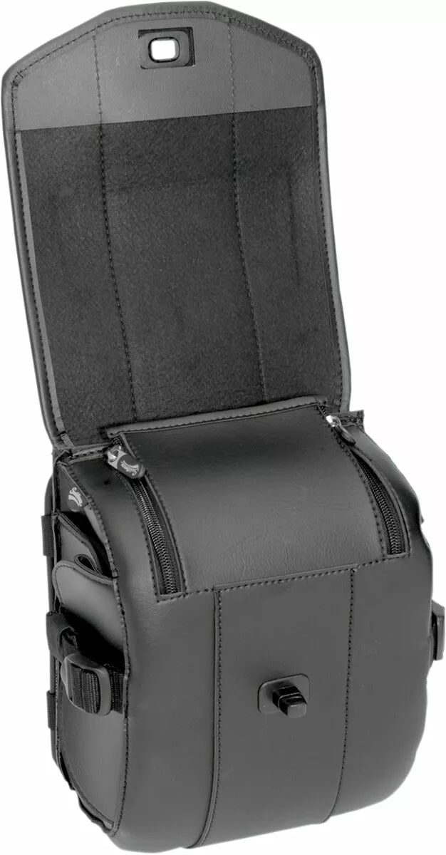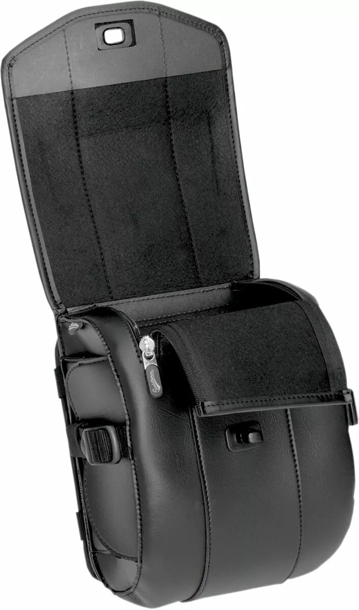 LEADING-EDGE Style and Construction Matches A Variety of Motorcycles From Customs to Performance Cruisers, Leather-Grained UV and Weather resistant 3mm Thick Saddlehyde ™ Materials with Sturdy Internal Reinforcing Hold to prote Zippered Opening Covered by Weather Flaps Fitted With ¼-Turn Hasps That Accept Mini-Padlocks For Security, Spacious Main Compartment Supplemented With Two Fold-Away Mesh Beverage Holders That Can Hold Water Bottles, Eases, Glasses And MUC mnohem hodně montážní popruhy, které se obtěžují kolem vaší sissy baru, ale mohou být také tvrdě připevněny k jiným předmětům, jako je vaše podložka opěradla, opatření: 8 "l x 4¼" h x 11 "w