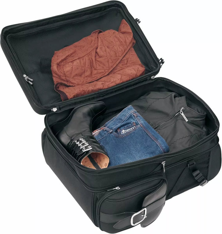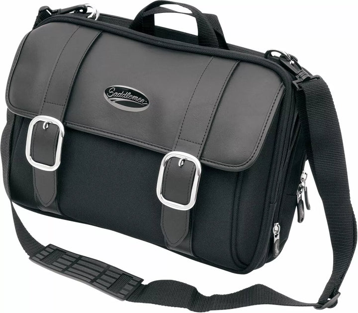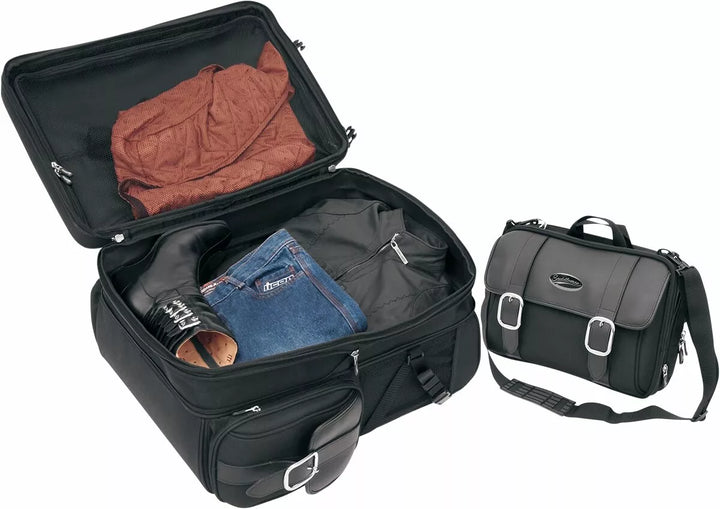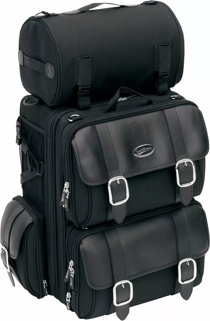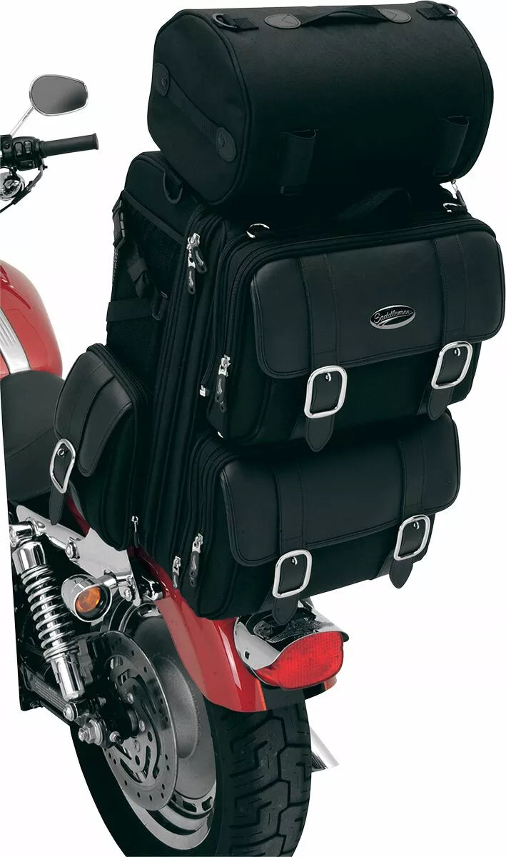 Velká taška navržená tak, aby přenášela vše potřebné pro dlouhou cestu na silnici; Bag Depth Expands 2-1/2 "To Meet Just About Any Cargo Need, Fully Adjustable Sissy Bar Mounting System Goes On In Seconds Over any Size and Style Sissy Bar Pad; Once Adjusted For Your Size Pad, You Never Need To Adjust It Again R850 Roll bag included for Extra Cargo Capacity; Top Cargo Straps Mount Included Roll Bag or Strap on Jacket, Rain Gear, etc., Top Carry Handle, Backpack Straps and Shoulder Strap for Easy Toting Off Bike, Internal Office Organizer and Zamykatelné zip a kolo 1200-denier Sadletuff ™ a kožené panely bez údržby Saddlehyde ™, rozšiřuje se na 15 "D