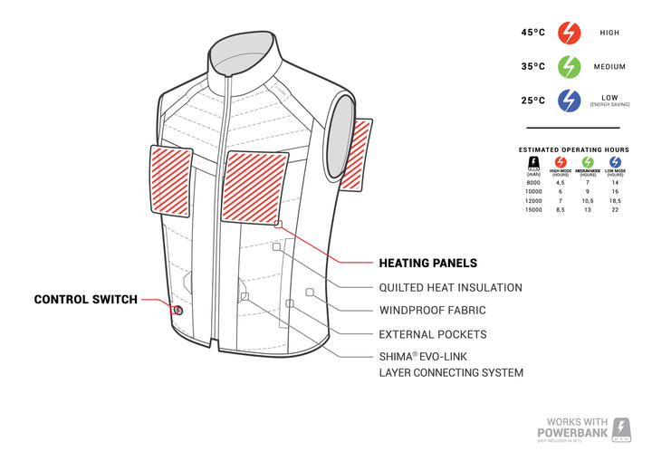 Shima Powerheat Poskytuje pohodlí, pokud standardní izolace nestačí. Elektrická vesta je zahřívána speciálními panely umístěnými na důležitých místech, aby byla zajištěna optimální teplota pro tělo. Produkt je určen k použití s Power Bank, který lze snadno připojit k kabelu USB skrytému ve vyhrazené kapse.