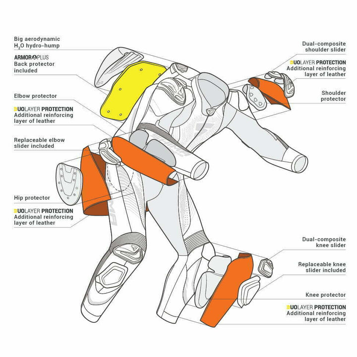 Při dalším tahu bude vaše bezpečnost zajištěna sadou certifikované ochrany proti ramenům, lokům, kolenům a kyčle spolu s vyhrazeným zadním krytem. Oblek může být také vybaven ochranou prsu SAS-TEC jako možnost, abyste se cítili ještě bezpečnější. Oblasti, které jsou nejvíce vystaveny poškození, jsou vylepšeny další vrstvou kůže - technologie ochrany duolayer zvyšuje odolnost vůči otěru a prasklinám.