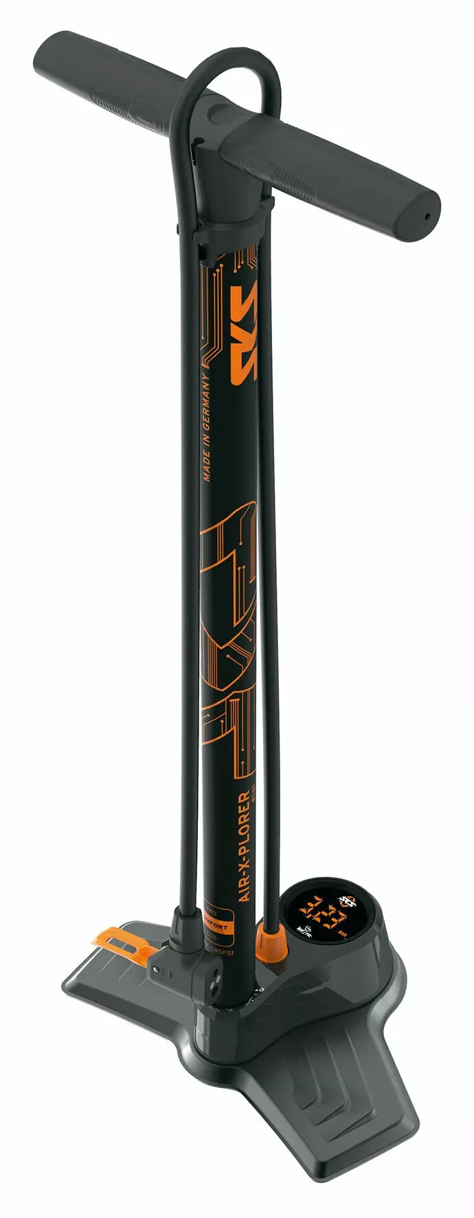 Podlahové čerpadlo SKS Air-X-prolezeru Digi 10.0 je zapůsobilo vysoce kvalitním digitálním tlakovým měřítkem LED. , Prvotřídní senzorová technologie zaručuje vysokou přesnost míry a poskytuje přesné hodnoty tlaku vzduchu do 10 bar (144 psi). Mezi další funkce patří klika z měkkého dotyku s popisovacím prostorem pro pneumatiky Für, extra dlouhé typy ventilů s vysokým tlakem. Baterie: 2 x Micro AAA., Vyrobeno v Německu.